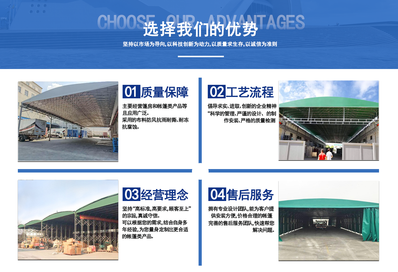 遼寧拓圖鋼結(jié)構(gòu)工程有限公司是一家專業(yè)從事推拉篷設(shè)計(jì)、制作、安裝、使用、維修的綜合性公司。公司主營:電動(dòng)雨棚、活動(dòng)雨棚、倉庫雨棚、體育類雨棚、篷房、篷布、帳篷等系列產(chǎn)品的制作與安裝。    遼寧拓圖鋼結(jié)構(gòu)工程有限公司堅(jiān)持以市場為導(dǎo)向,以科技創(chuàng)新為動(dòng)力,以質(zhì)量求生存,以誠信為準(zhǔn)則,倡導(dǎo)求實(shí)、進(jìn)取、創(chuàng)新的企業(yè)精神。“科學(xué)的管理、嚴(yán)謹(jǐn)?shù)脑O(shè)計(jì)、 的制作安裝、嚴(yán)格的質(zhì)量檢測、良好的后期服務(wù)成就企業(yè)的信譽(yù),為您提供優(yōu)質(zhì)服務(wù)。    遼寧拓圖鋼結(jié)構(gòu)工程有限公司傾力于開發(fā)應(yīng)用三維空間結(jié)構(gòu)與新材料的結(jié)合,將廣告藝術(shù)視覺表現(xiàn)形式與張力膜材科學(xué)的結(jié)合,推出多彩推拉蓬,依靠先進(jìn)的科學(xué)技術(shù),將推拉蓬建筑表現(xiàn)形式無限延伸,立志走在建筑科學(xué)的前沿,引導(dǎo)建筑時(shí)尚潮流,我們的目標(biāo)是使推拉蓬建筑在中國發(fā)展壯大。    遼寧拓圖鋼結(jié)構(gòu)工程有限公司憑著極強(qiáng)的事業(yè)熱情和豐富的專業(yè)經(jīng)驗(yàn)以“勤勉進(jìn)取、銳意創(chuàng)新、至誠至信”的精神使公司得到迅速健康發(fā)展,業(yè)務(wù)范圍遍及全國。科學(xué)的管理、嚴(yán)謹(jǐn)?shù)脑O(shè)計(jì)、高標(biāo)準(zhǔn)的制作安裝流程,嚴(yán)格把控產(chǎn)品質(zhì)量,熱誠的售后服務(wù)是企業(yè)競爭力的源泉。    遼寧拓圖鋼結(jié)構(gòu)工程有限公司人愿以最誠摯的態(tài)度,歡迎廣大客戶的蒞臨與溝通!愿為市場提供優(yōu)...